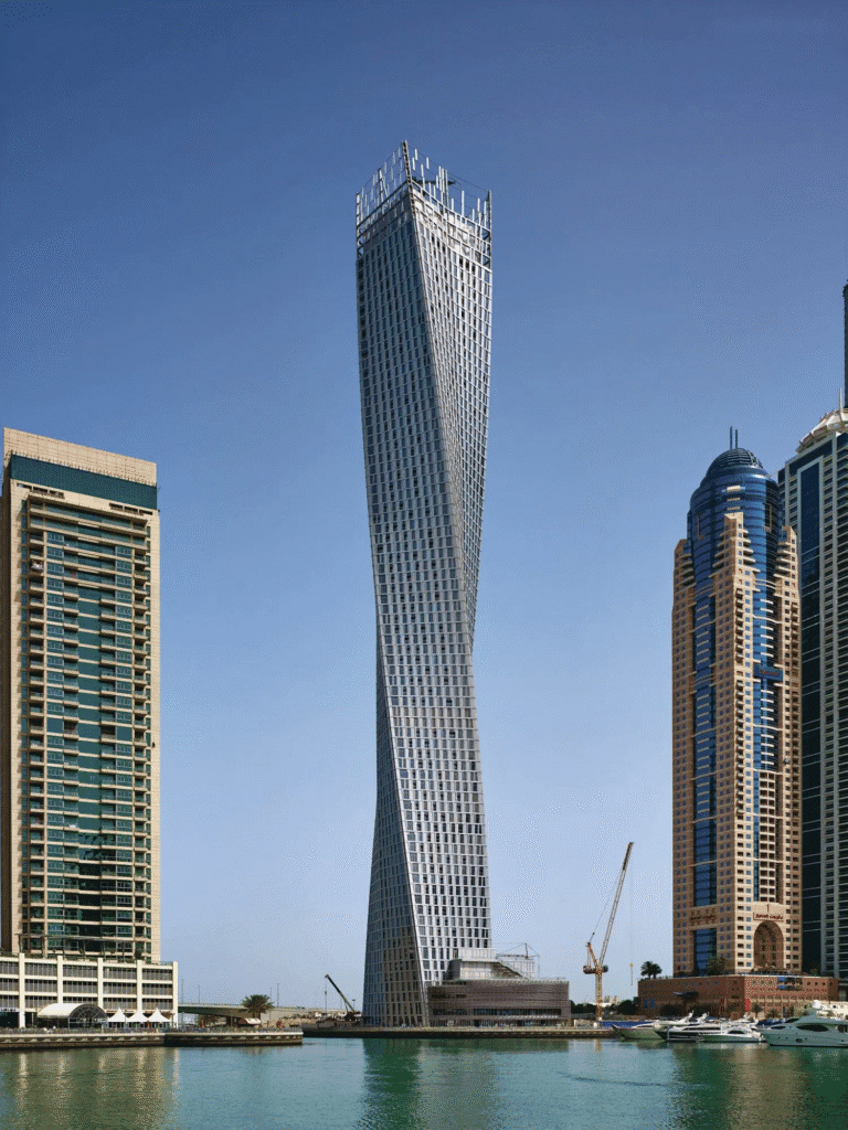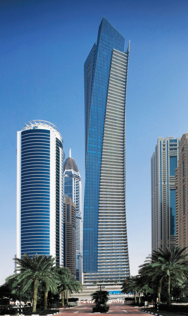 Cayan Tower, also known as the “Twisting Tower,” is an architectural masterpiece that twists 90 degrees from base to top. Standing at 307 meters, it offers breathtaking views of the Arabian Gulf and Dubai Marina. The tower features luxury apartments, a sky lounge, and a rooftop infinity pool. Its unique design not only makes it visually iconic but also improves structural stability by reducing wind load. Residents enjoy a blend of modern design and practical living with access to essential services and leisure options nearby.
